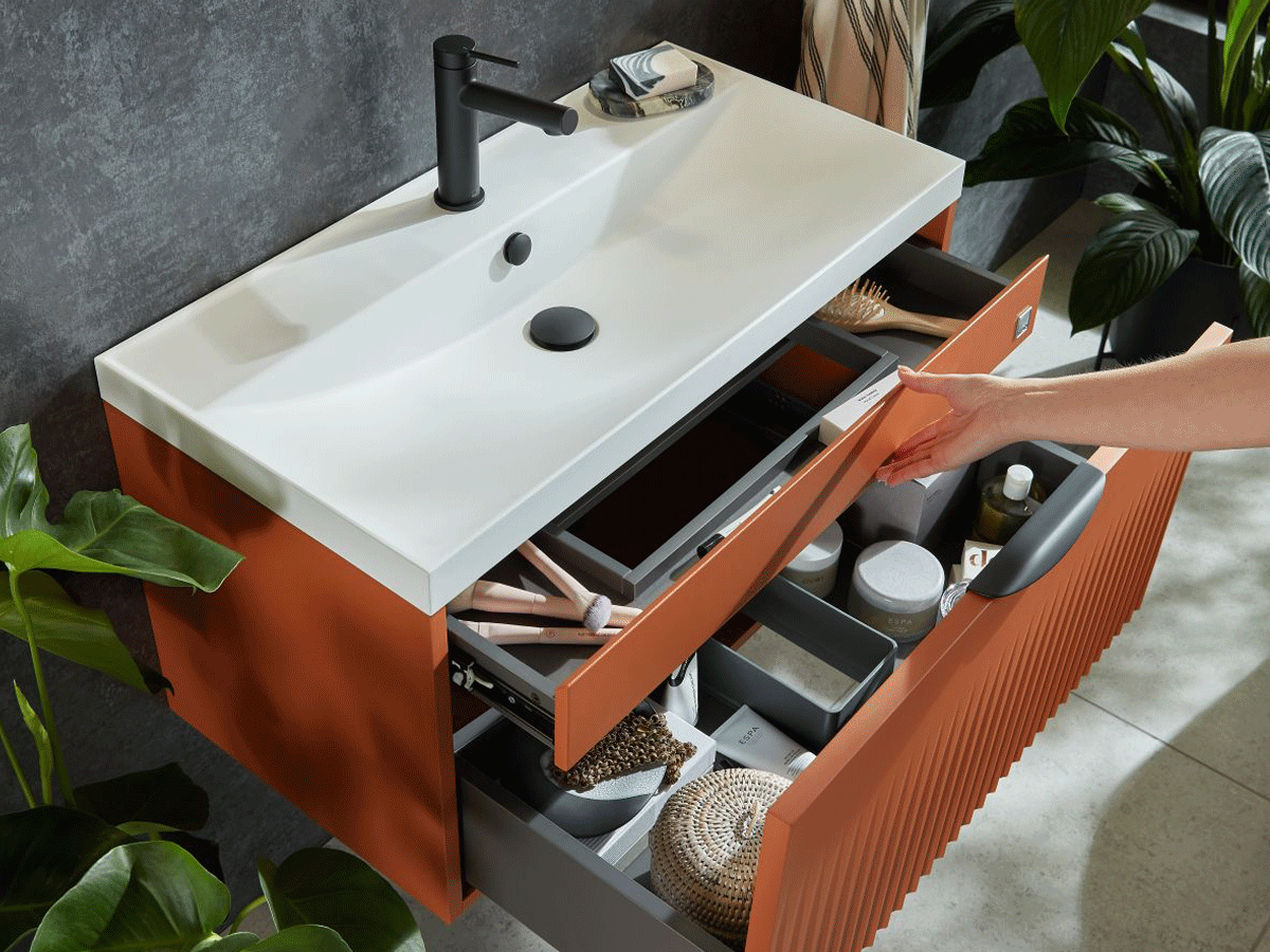 Orange bathroom furniture that pops with personality. Featuring vivid vanities, modern worktops and more in our signature terracotta shade, the perfect hue to energise and enrich contemporary spaces.