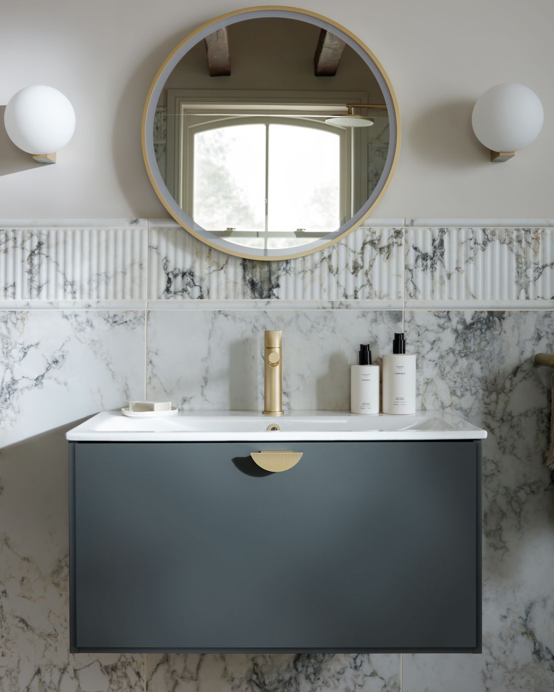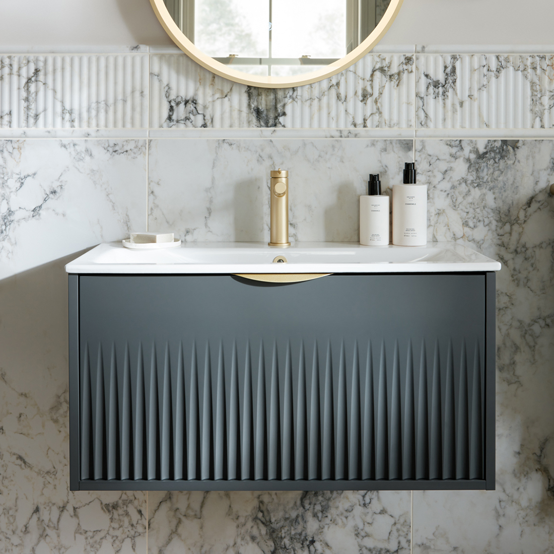Vanities with an elegant variated flute, and coordinating leverless knurled brassware unleash the wild into your space. Where bold, fluted curves and organic textural accents awaken your senses and inspire your creativity.